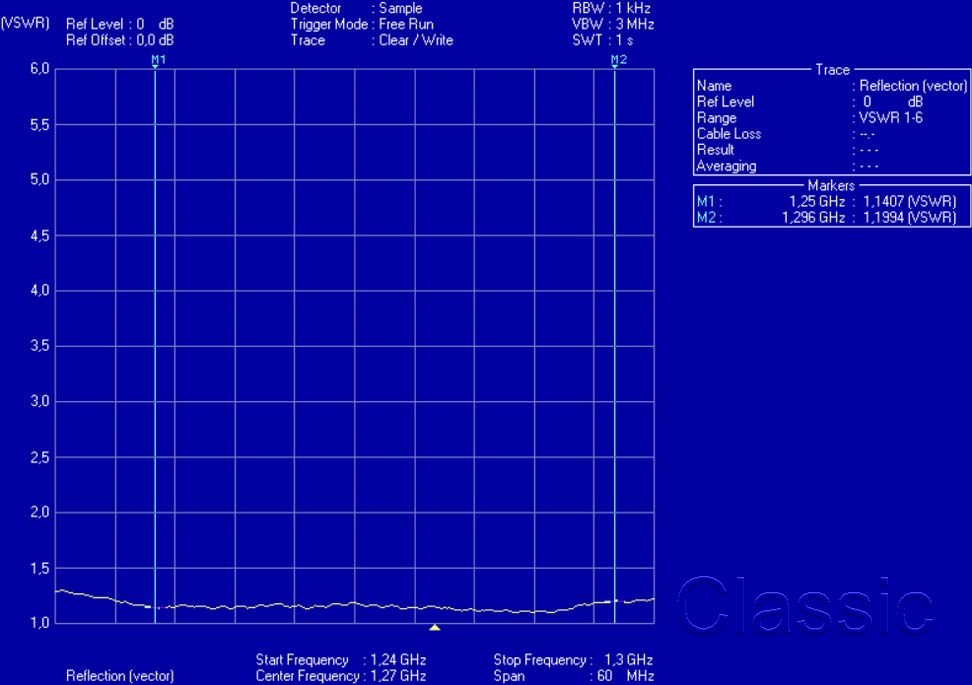 ANjo YA130037E ist eine gewinn-optimierte 37 EL. wide-space Yagi-Antenne mit gefaltetem Dipol und breitbandiger 50-Ohm-Anpassung; siehe SWR-Diagramm.